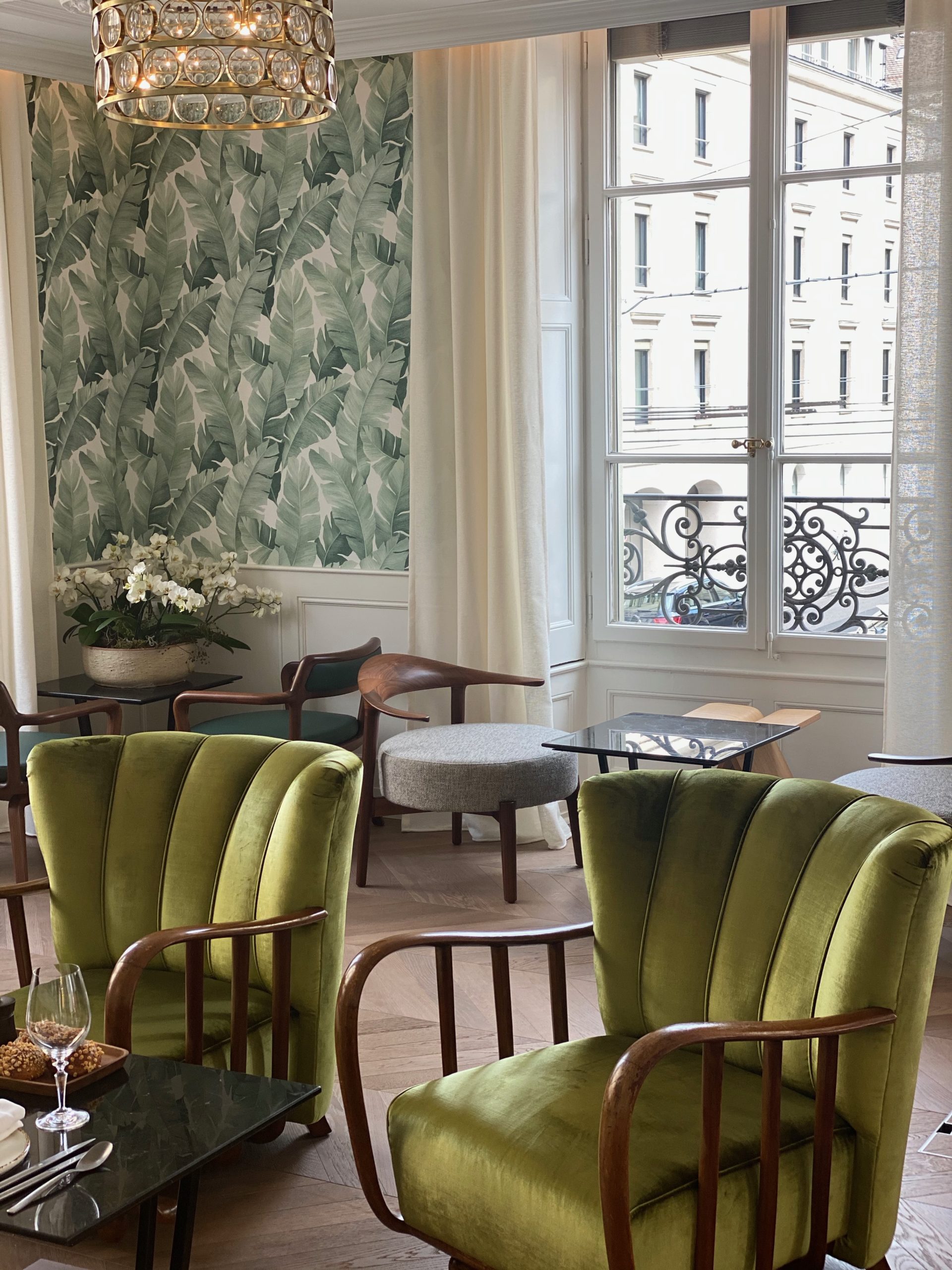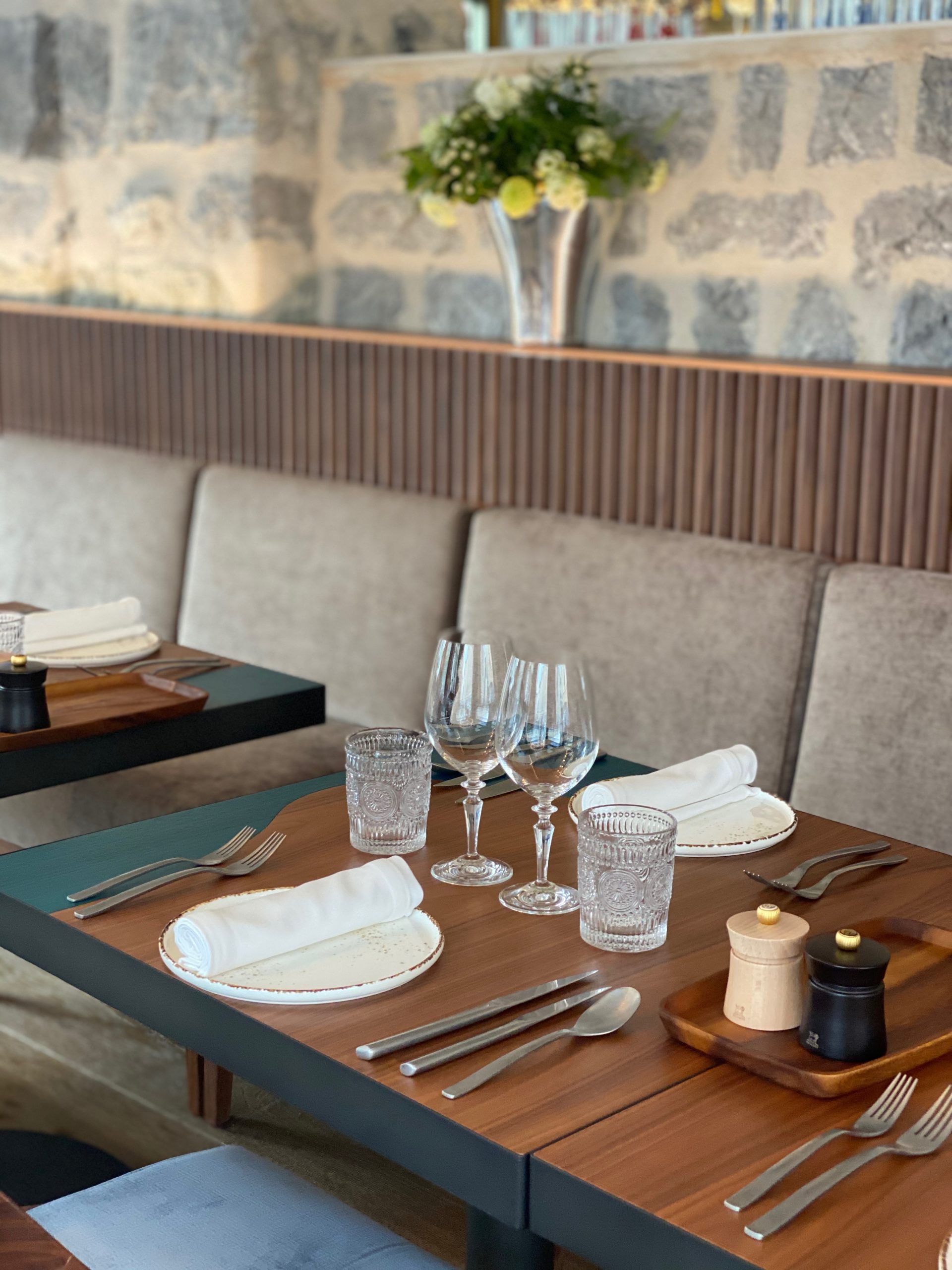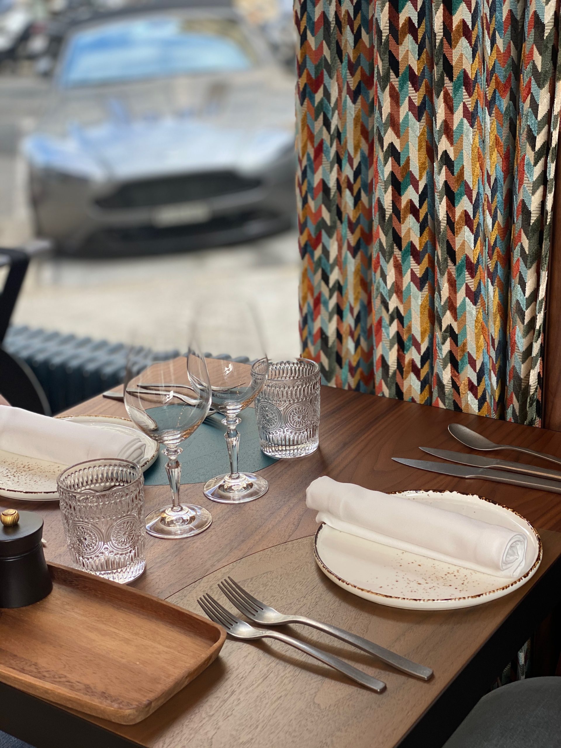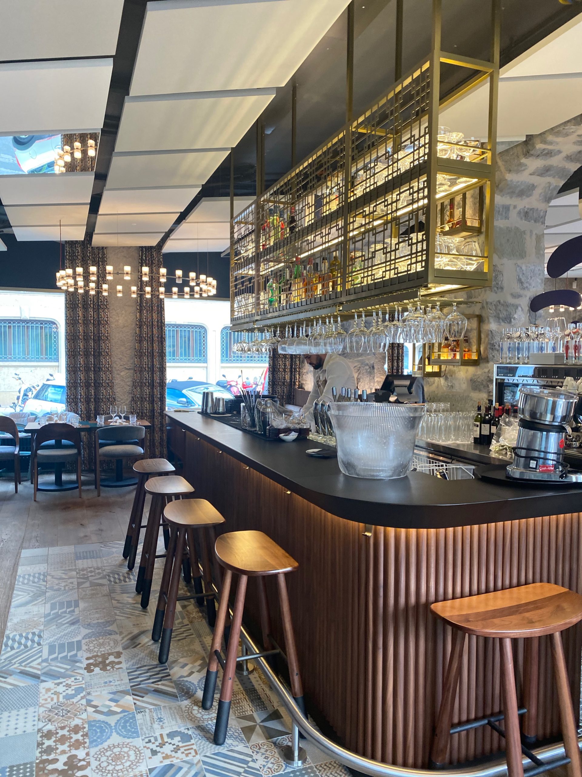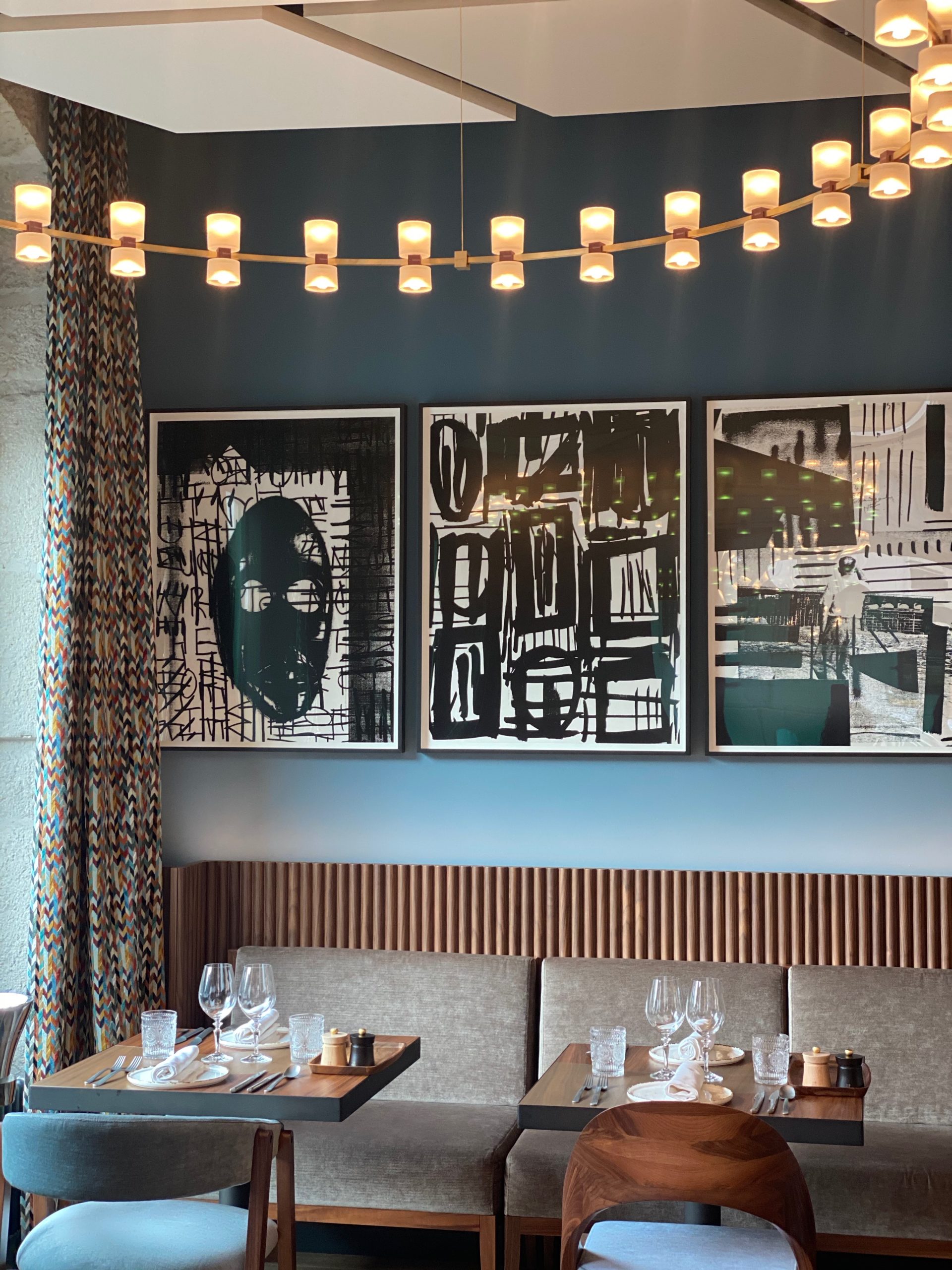Pas de soucis, je m’installe, je zieutte tout ça, et je prends quelques photos (enfin 1000), c’est « whaou »! Des matériaux nobles, des murs en pierre, des bois précieux, des velours élégants (j’ai adoré les motifs à chevrons colorés des rideaux), des éclairages subtils et des œuvres d’art (comme dans tous les restaurants du chef Chevrier): un combo qui marche -même si ca fait beaucoup pour les yeux-, le résultat est élégant et chaleureux tout en restant un peu formel: ça match totalement avec le quartier et la clientèle.