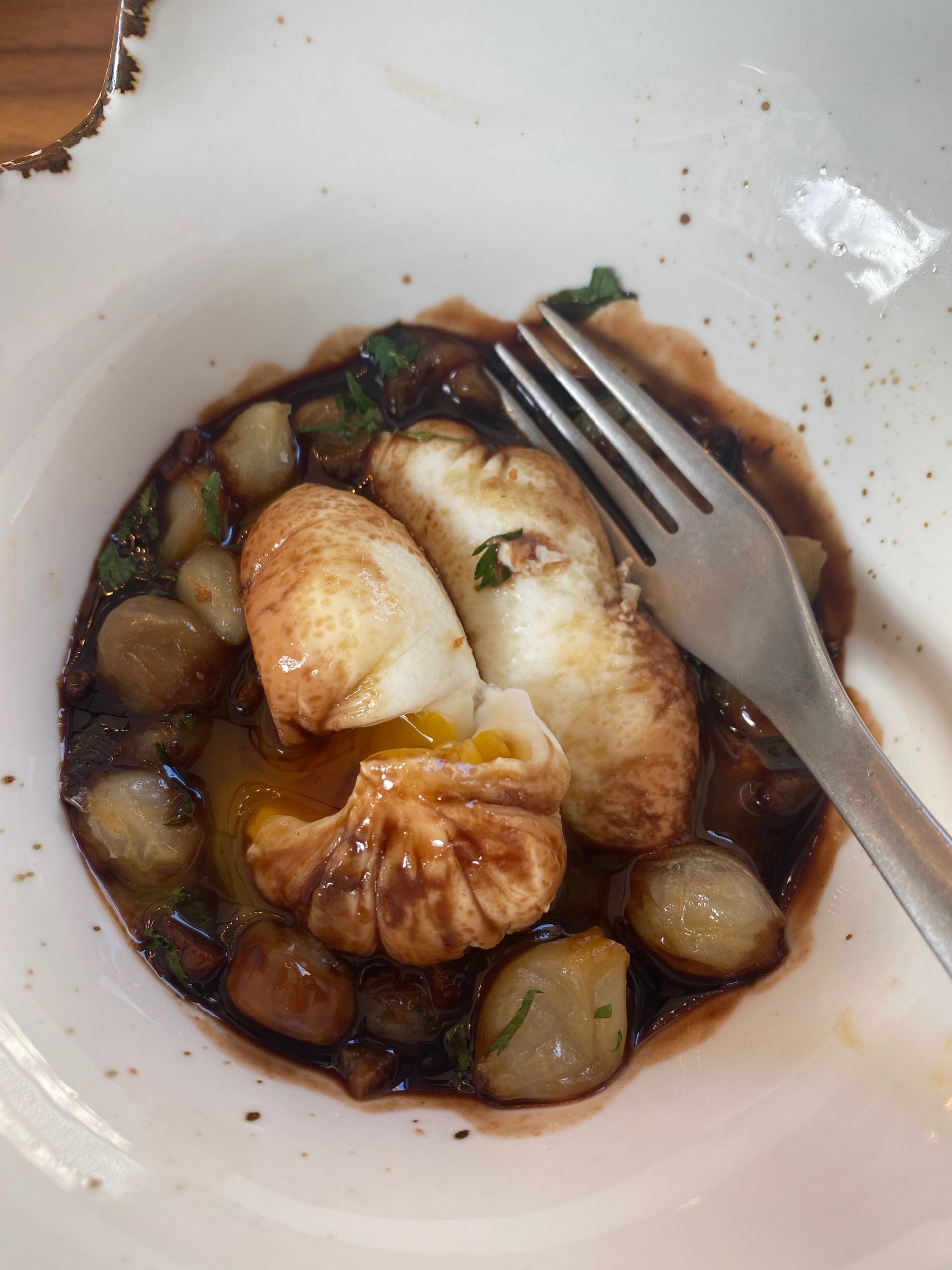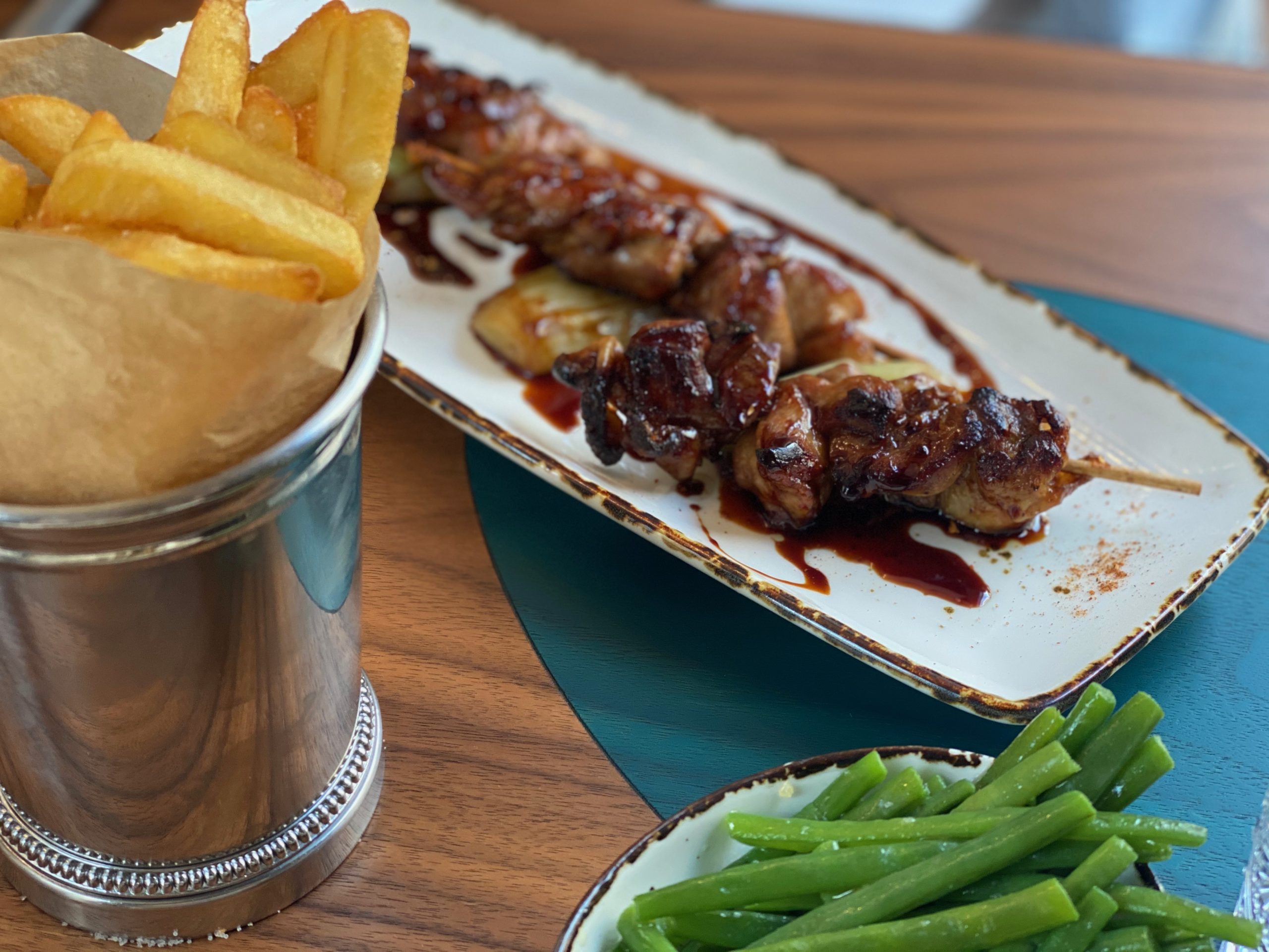 On note les quelques plats aux influences asiatiques (qu’aime beaucoup le chef Philippe Chevrier). On remarque en particulier les brochettes Teriaki. Marion nous indique que des fours à charbon viendront prochainement compléter le matériel de la grande brigade (10 personnes tout de même) pour proposer une cuisson optimum de ce plat, on a hâte. Sur la carte, il y a finalement un peu de tout, mais pour jouer le jeu « oeuf et poulet », je choisis les fourchettes de volaille sautées en persillades avec une sauce « cuisse de grenouilles ». Proposé à 30 francs, ce plat est extrêmement copieux (et un chouia gras), la prochaine on se tentera un « classico » avec le demi-poulet rôti à la broche qui me fait trop envi. Côté desserts: réjouissance! Il y a un sacré choix avec de très belles douceurs de pâtissiers, parfaits pour une touche finale qui fera plaisir.