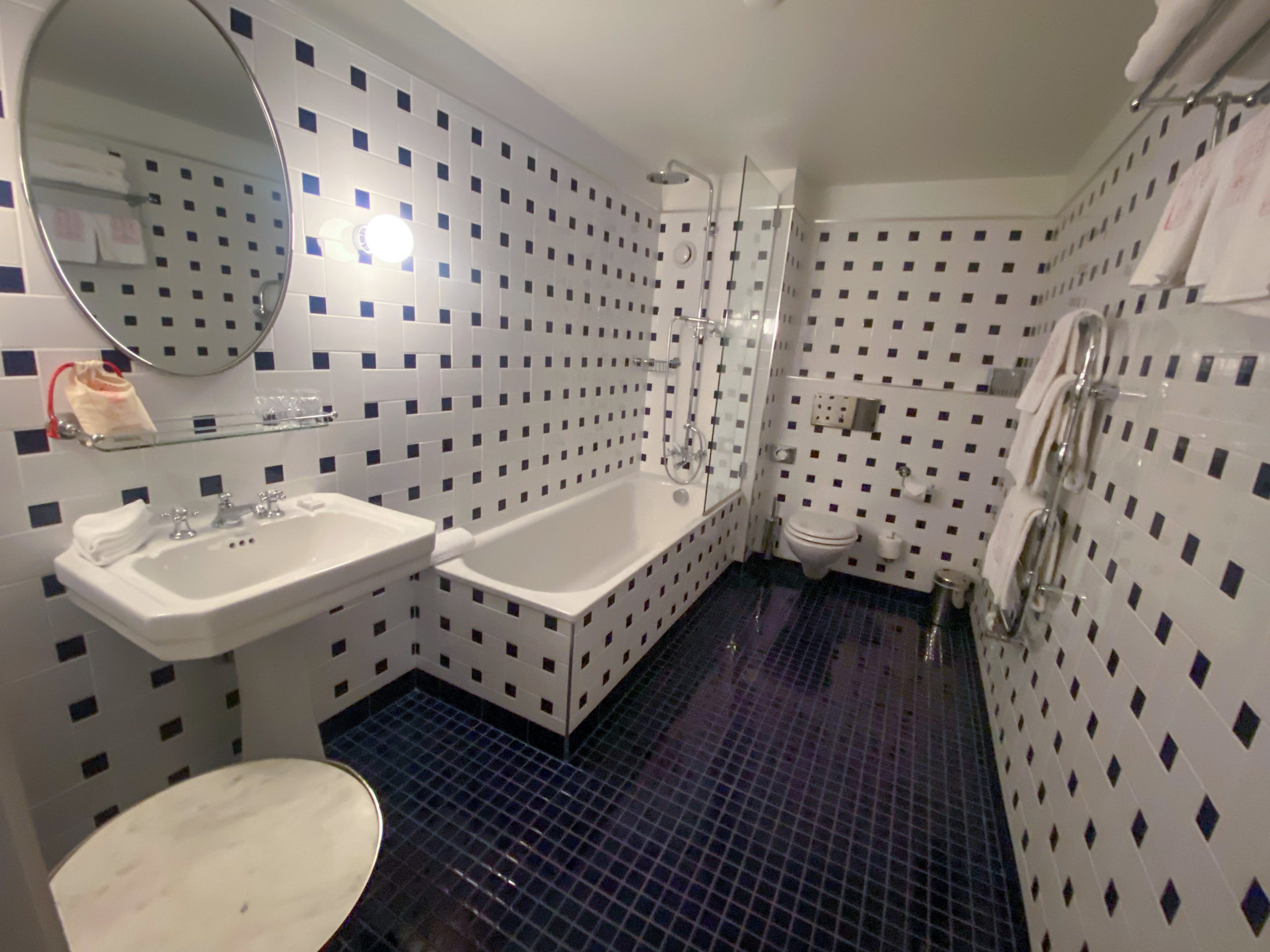 Nous avons adoré le décor rétro de la chambre et ses superbes détails, les luminaires en particulier (une partie du mobilier est vintage, une autre est de la réédition d’articles anciens). Tout cela crée un astucieux contraste avec salle de bain aux motifs graphiques. J’ai aussi beaucoup aimé le linge de salle de bain brodé avec l’effigie de l’Expérimental Chalet.
